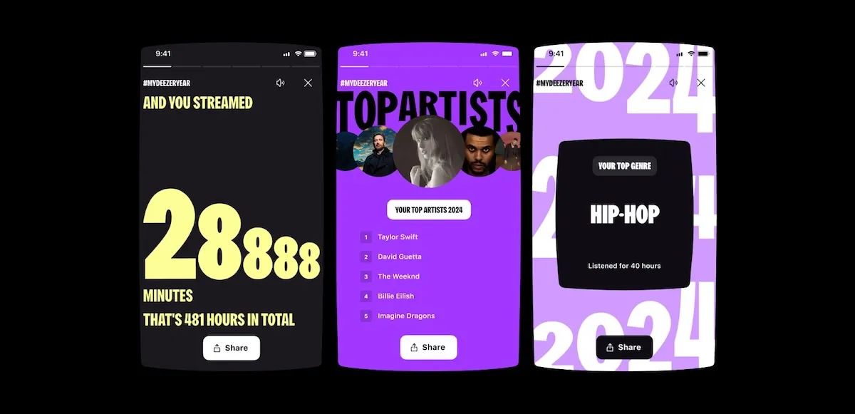 - Deezer: “My Deezer Year” mang đến trải nghiệm thú vị với tính năng “roasted” (châm chọc) hoặc “hyped-up” (tâng bốc) dựa trên gu âm nhạc của bạn, cùng với câu đố kiểm tra bạn bè và người thân có hiểu rõ gu âm nhạc của bạn hay không.